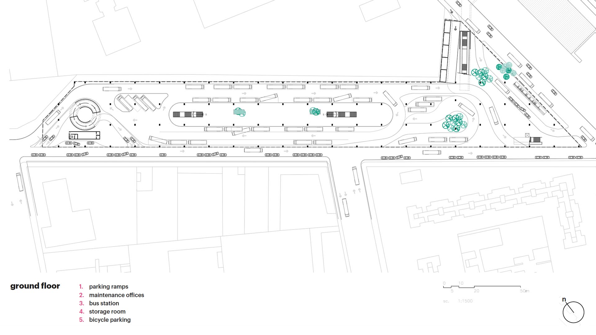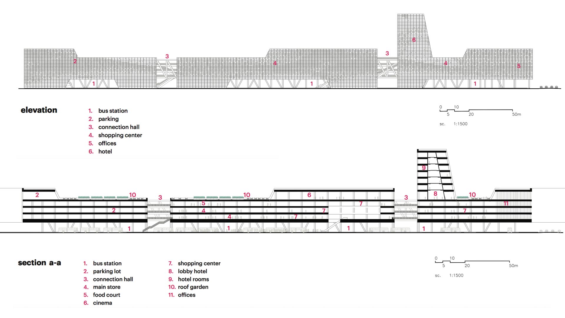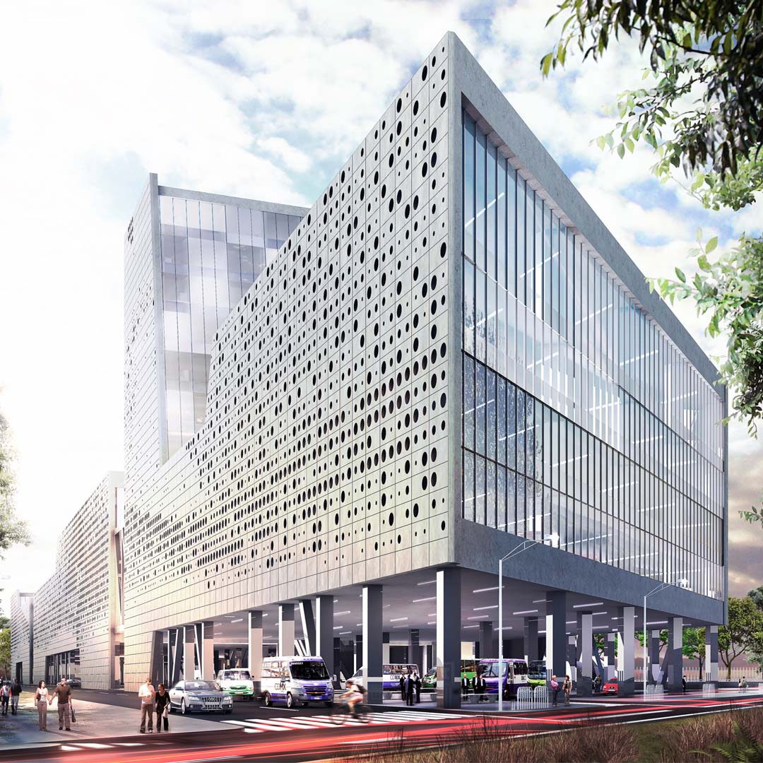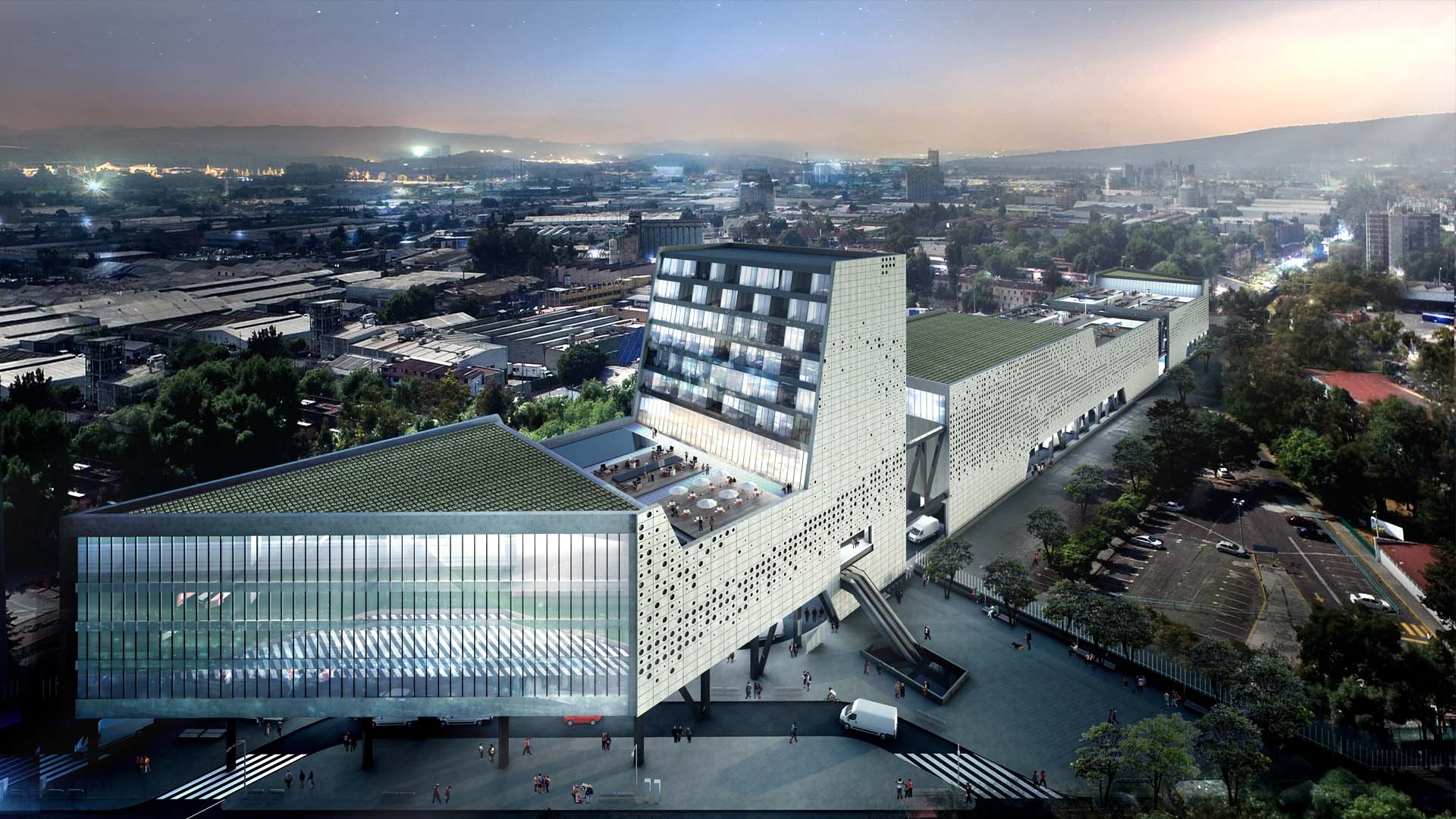 this is a proposal for one of mexico city’s new transportation hub projects, connecting commuters between the city’s central subway system and a bus terminal for outbound buses to the northern suburbs. the project also integrates incentive parking, vast shopping and entertainment facilities, offices and a hotel. due to the particular dimensions of the site, the building’s shape is slim but long, resulting in a 400-meter-long landmark building, which enhances the identity of mexico city’s neglected northern districts.