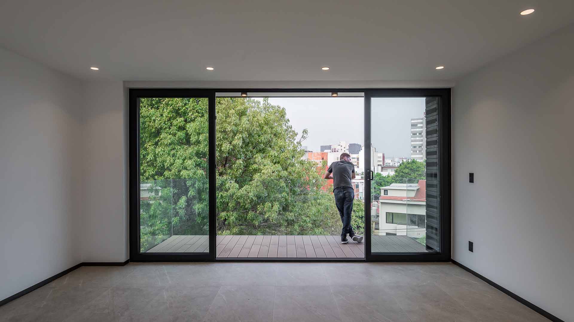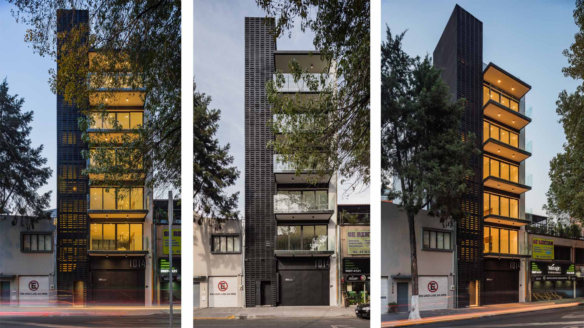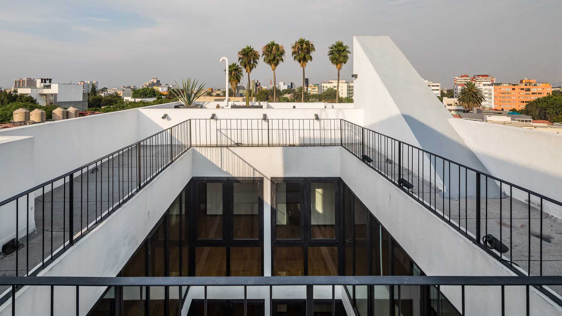 with a front of less than 8 meters, the project needs to maximize internal areas within each apartment. this is achieved by a generous central light well, allowing plenty of light to spill into interiors and open it up in order to make each apartment feel bigger than it actually is. there is only one apartment per floor, totaling five. the penthouse has its own roof garden, which is connected directly with the apartment itself. a commonly-used roof garden gives access to a generous terrace with astonishing views over mexico city. the contemporary and minimalist style of the façade features a wall made of latticework on one flank and ample, glazed balconies on the other.