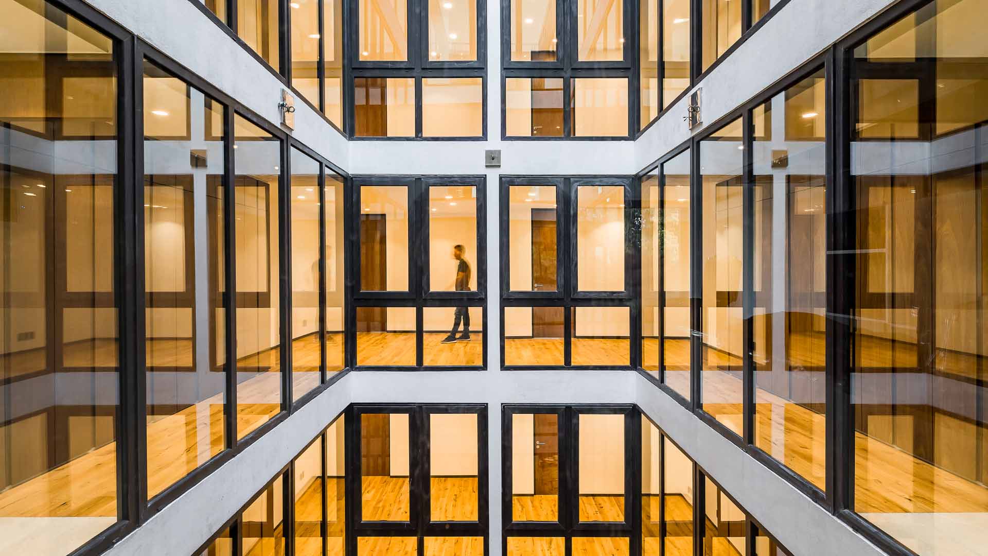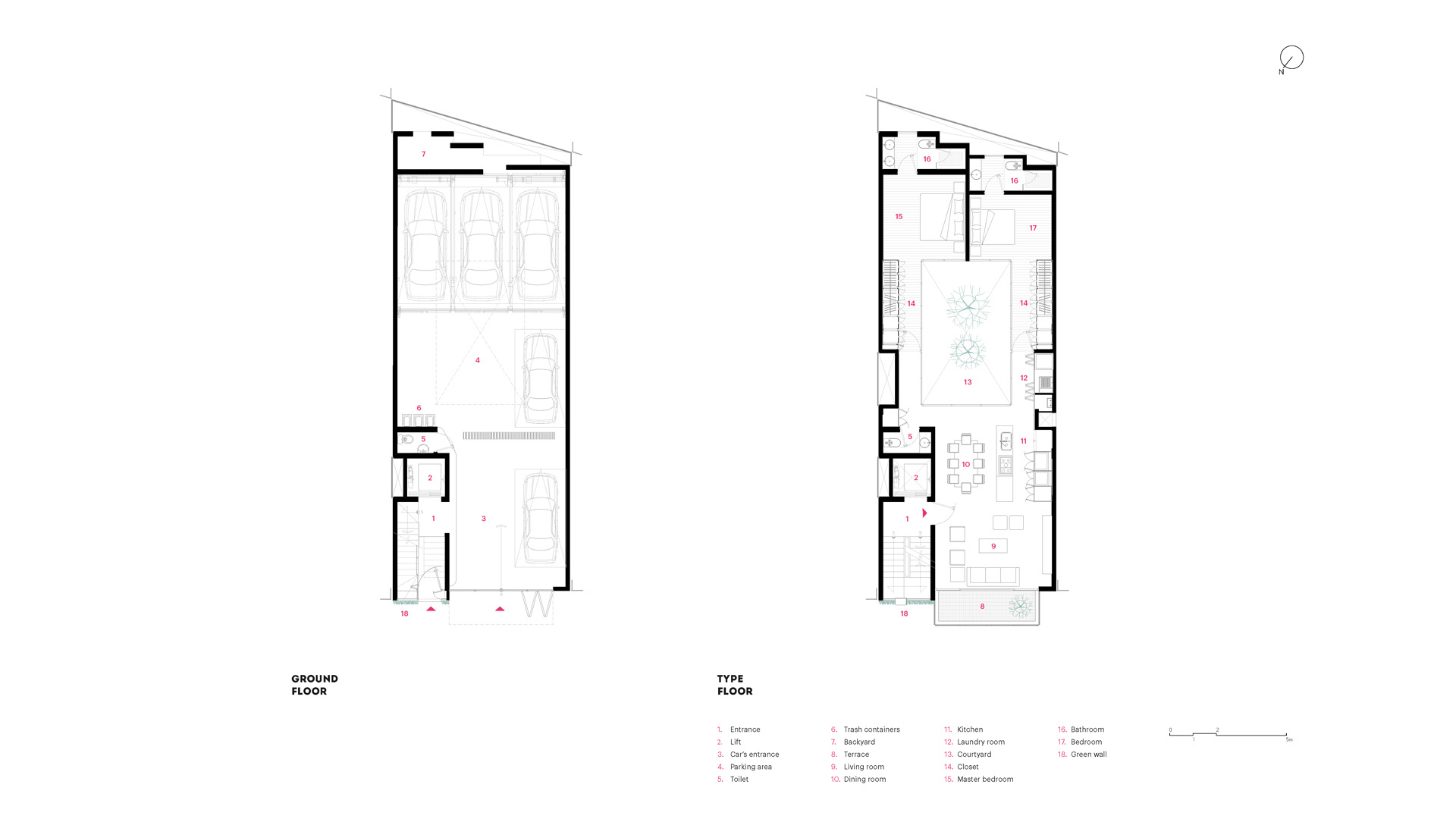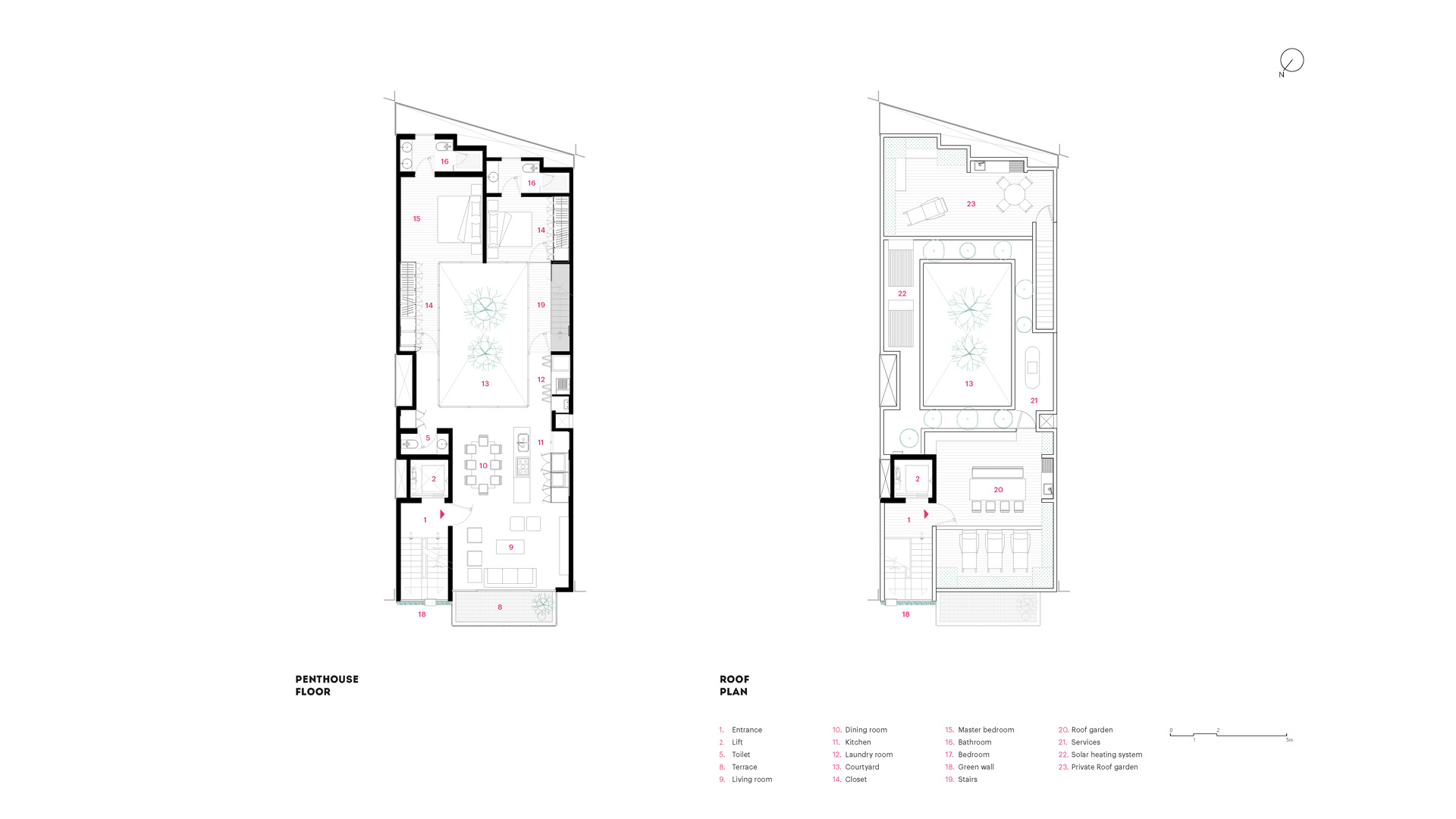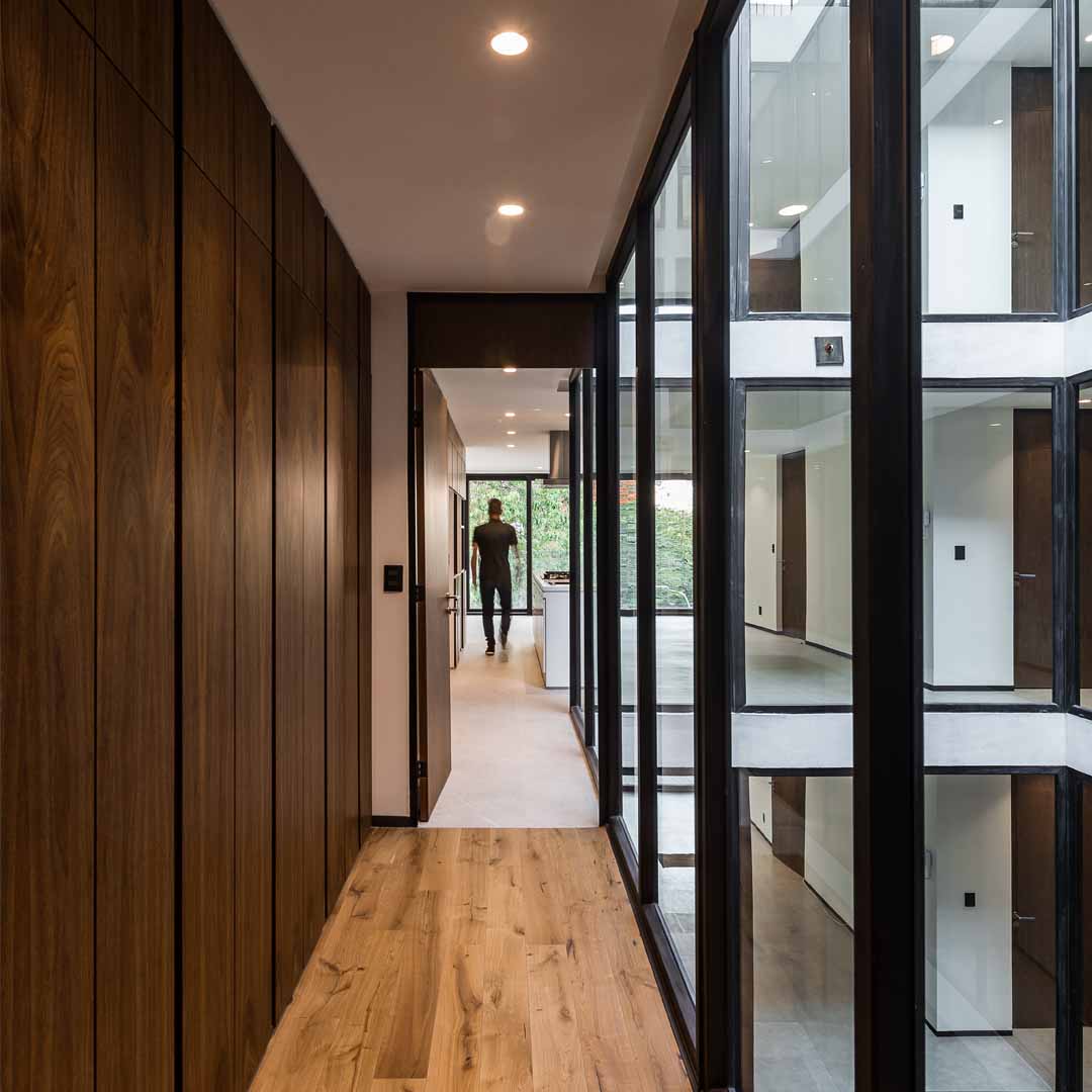 with a front of less than 8 meters, the project needs to maximize internal areas within each apartment. this is achieved by a generous central light well, allowing plenty of light to spill into interiors and open it up in order to make each apartment feel bigger than it actually is. there is only one apartment per floor, totaling five. the penthouse has its own roof garden, which is connected directly with the apartment itself. a commonly-used roof garden gives access to a generous terrace with astonishing views over mexico city. the contemporary and minimalist style of the façade features a wall made of latticework on one flank and ample, glazed balconies on the other.