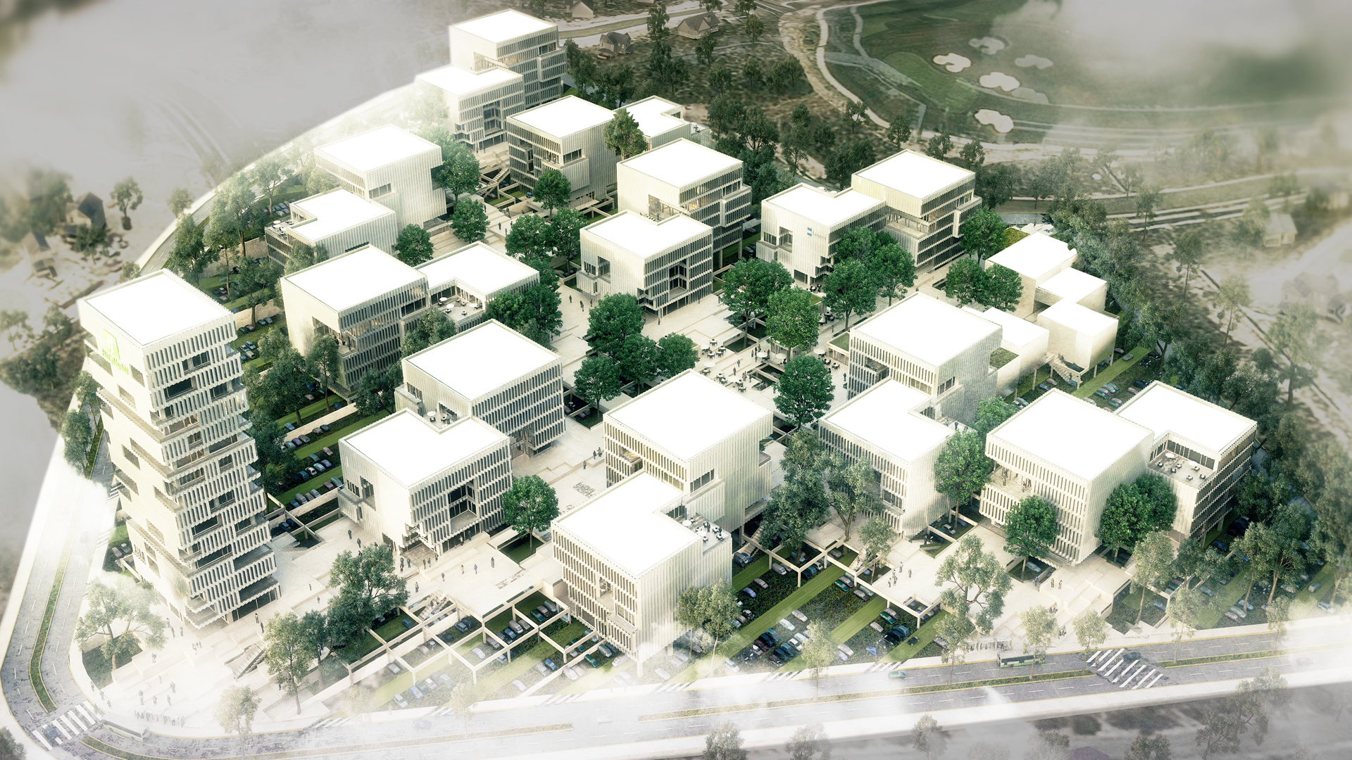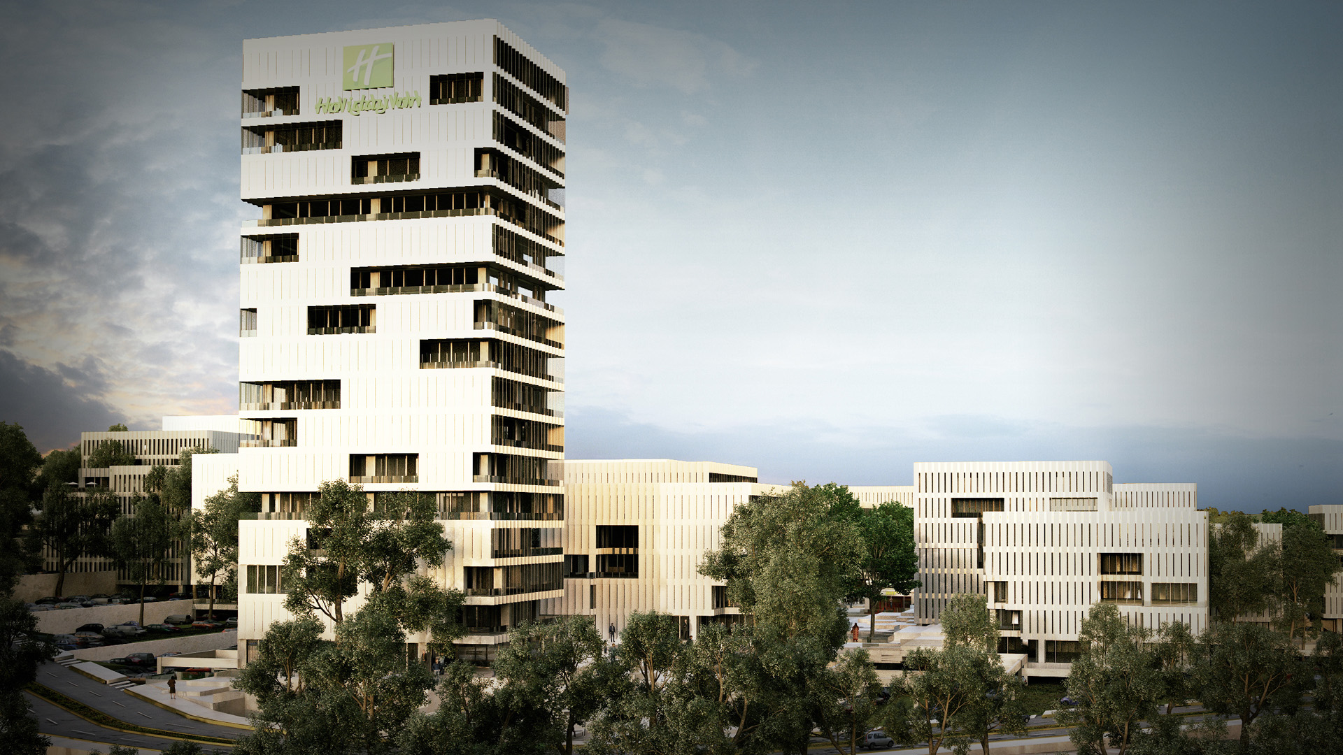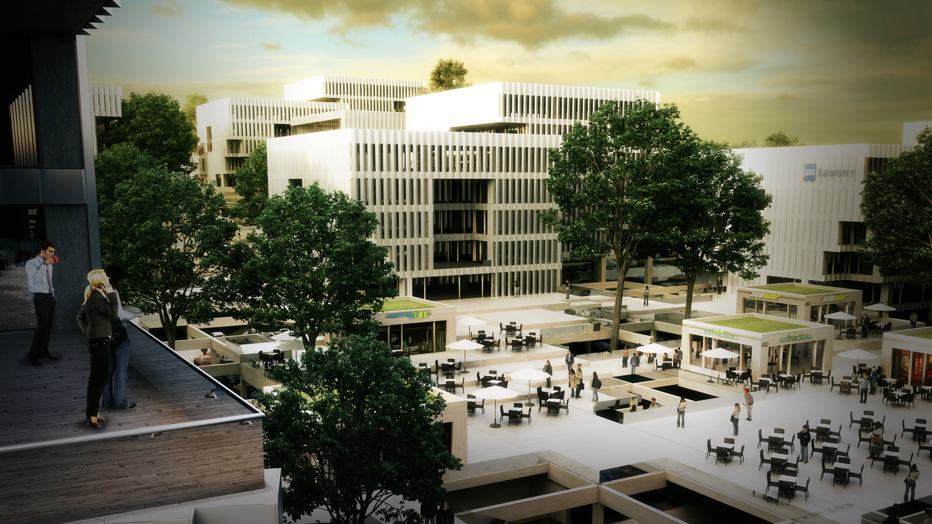 one of mexico’s leading developers recently earmarked ten hectares the zibatá neighborhood of queretaro for the development of a massive mixed-use business park. the plan includes twenty office buildings, ground floor retail, a hotel and apartment units. an all-purpose parking structure for 3,600 cars lies beneath the entire park with distributed access points to the buildings above. built on a 40 m slope bordering a golf course and university campus, the design utilizes the site’s topography through a system of interconnected terraces that sustain an illusion of level ground. amid a delightful variety of trees planted at the garage level that thrust through openings in the pedestrian plaza, users can circulate to and from an assortment of restaurants, banks, movie theaters, and a convention center.